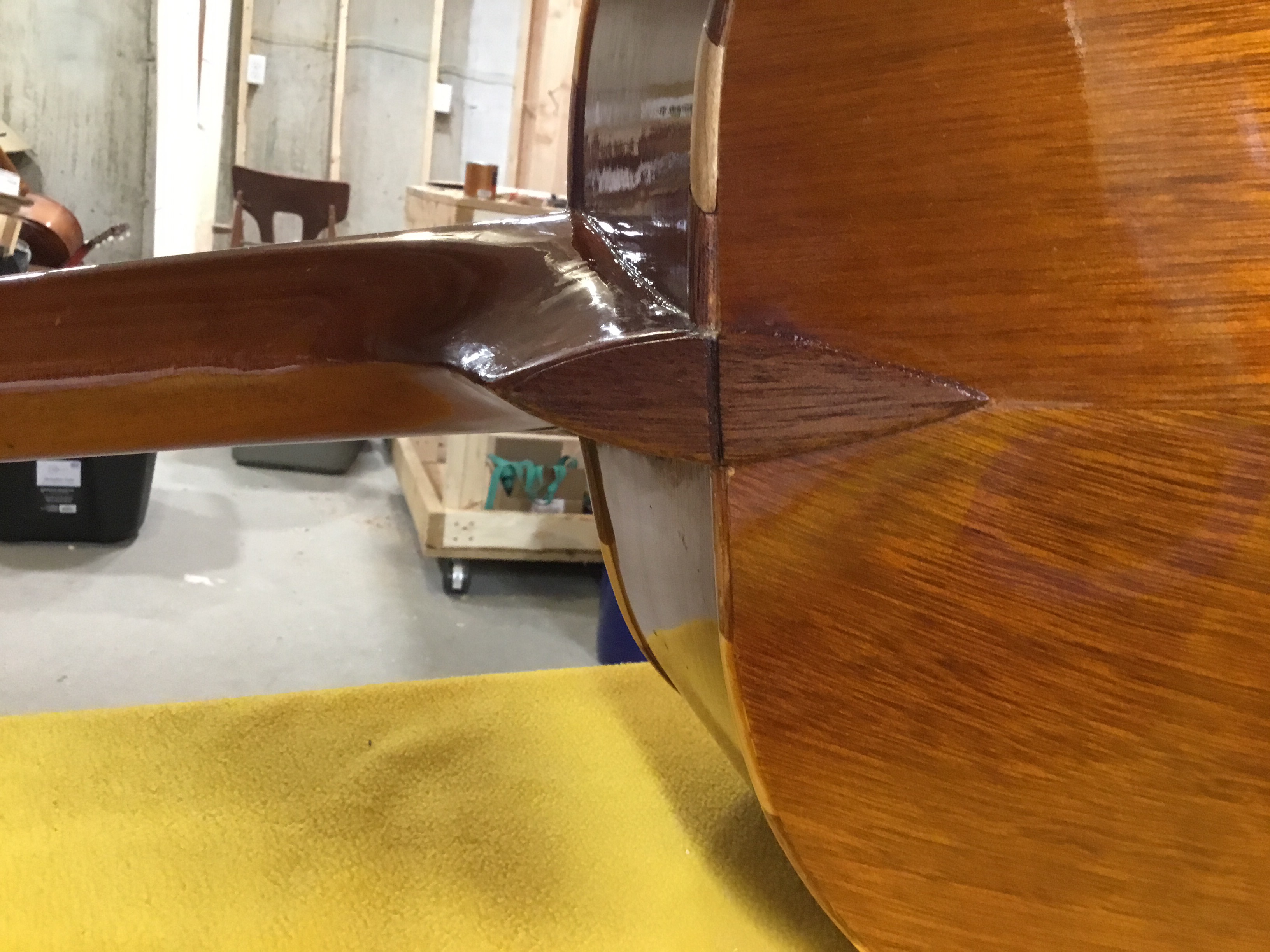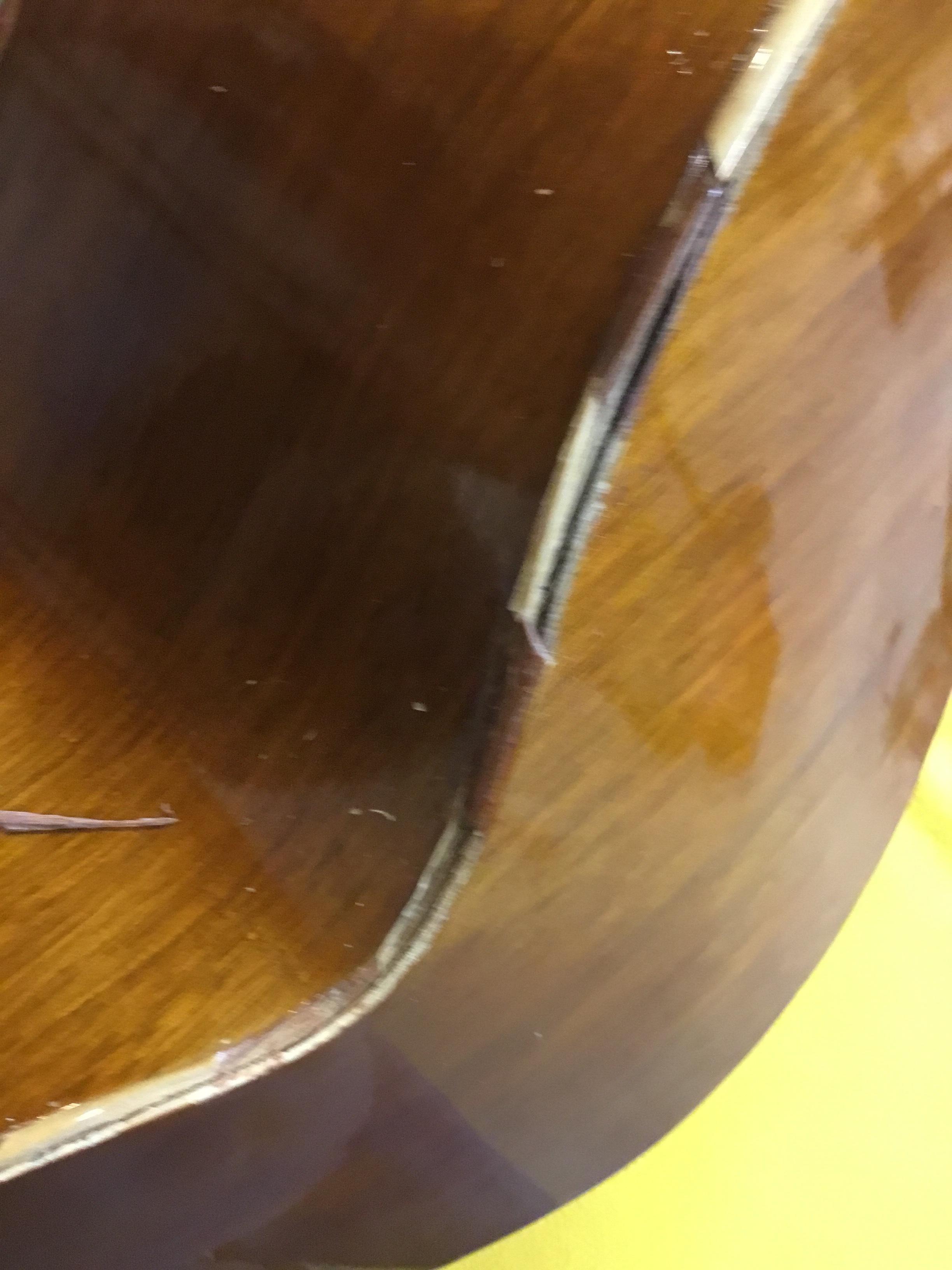 There is a farm near our home that has a regular barn sale every weekend in the fall. We regularly pass this place and often say “hey we should drop in on this some time”. Well, we finally did. There was some really cool stuff for sale in multiple different farm buildings. Being the curious cat that I am, I poked my head into one of these buildings and saw a big (I mean huge) sign on the wall in the shape of a guitar … and Mitch. I blurted out “how much for the sign?” … and Mitch responded “not for sale …. nothing in here’s for sale”. He went on to explain that his wife runs the sale, he was just working in his building. But it gave us an opening to start a conversation about guitars. I mentioned I was a luthier, and he mentioned he had a mariachi bass that needed repair. He bought it broken, because it was such a cool instrument, and was waiting to find someone to repair it. I told him I lived right down the street and he gave me his card and told me to call sometime about the Guitarron … which is, of course, exactly what I did. I came by later in the week and examined it. It appeared that somebody must have dropped this (pretty hard) because the top side and the back were completely separated. There was also a crack where the neck met the guitar, and the seam in the back was beginning to separate…. ouch!
