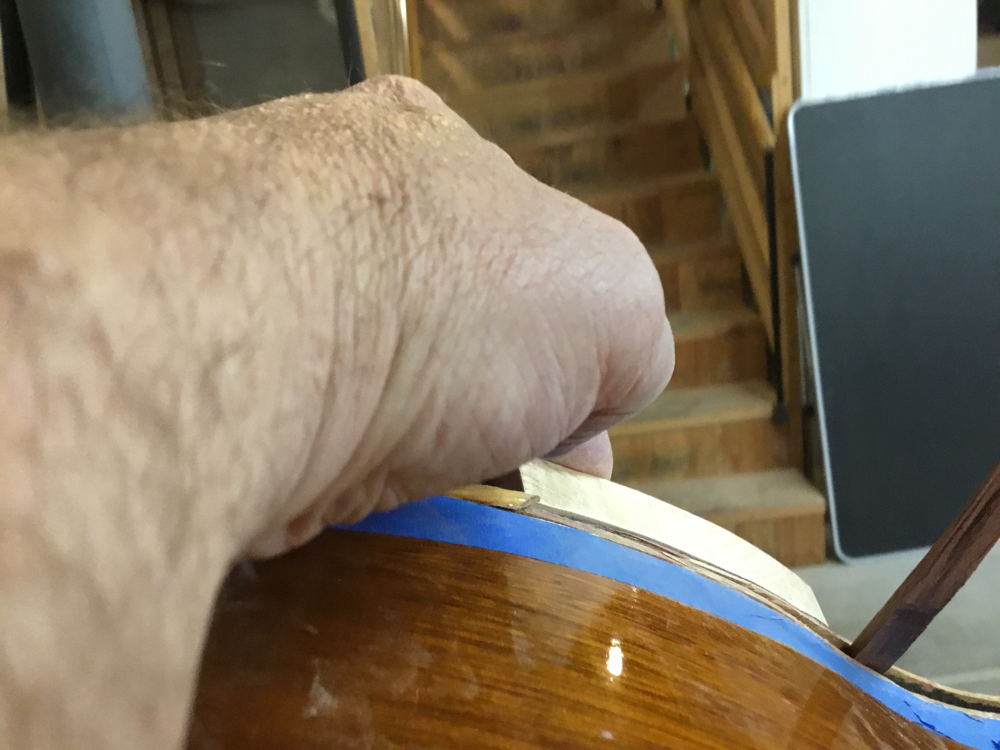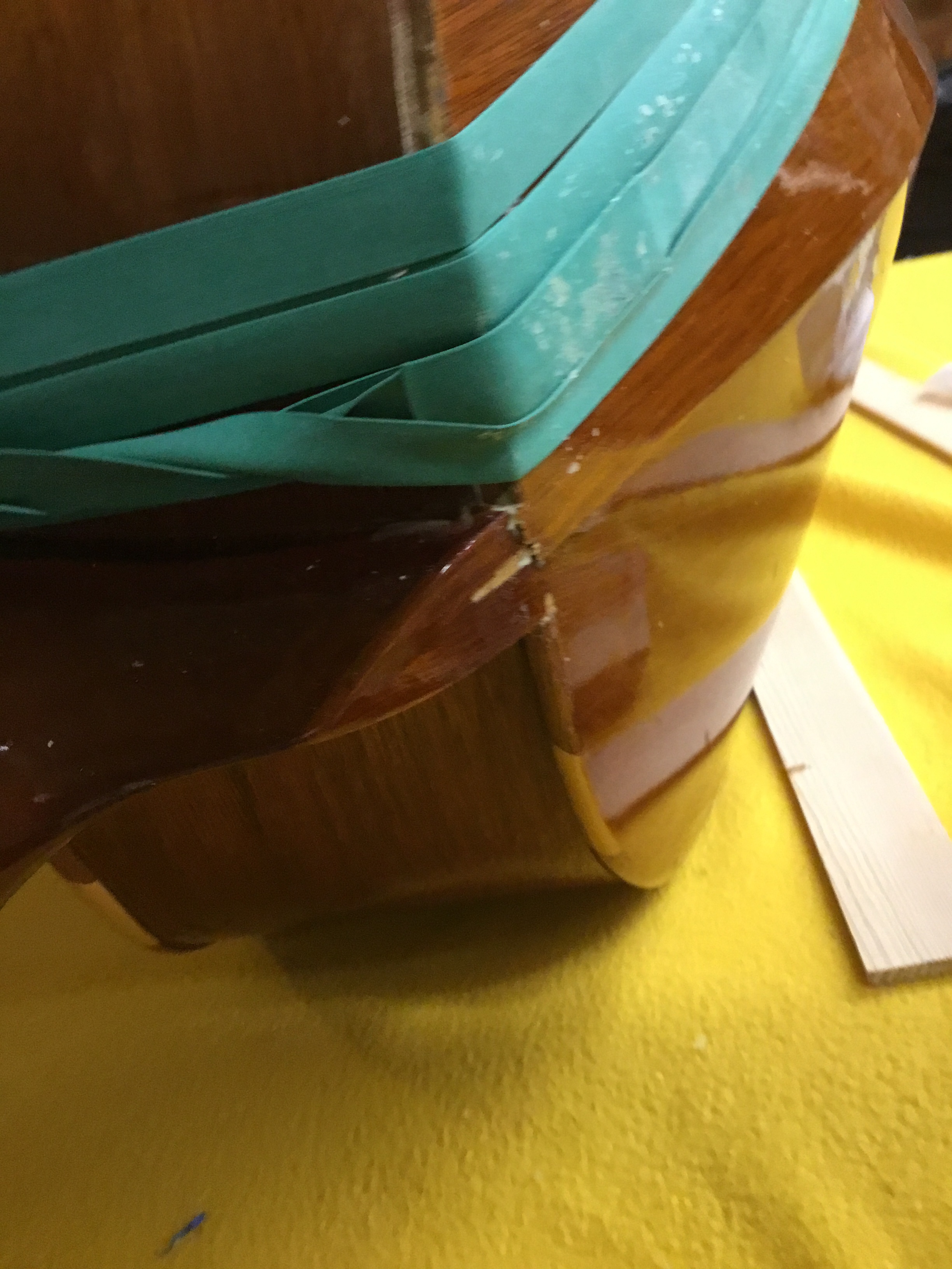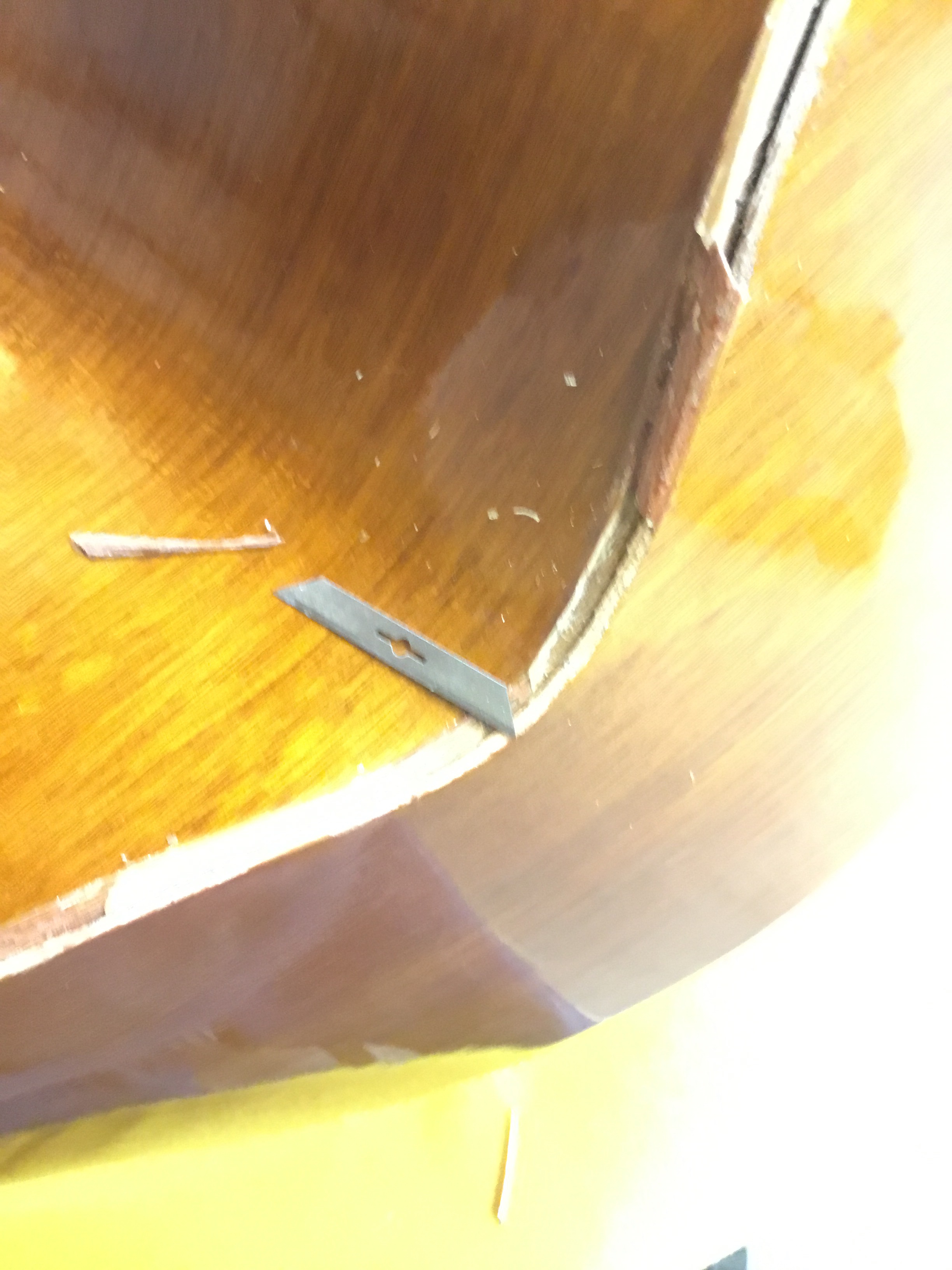 The first thing that needed to be done was to remove the binding where the back had separated. Much of it was already gone and what was left was split and splintered. I taped the edges (always tape the edges!) and went to work with chisels and razor blades to slowly and carefully remove the wood. There was some unavoidable tear out and I did slightly gouge the side with a chisel at one point but was able to hide the mistake (more on this later). Hey, no one’s perfect (especially yours truly)!