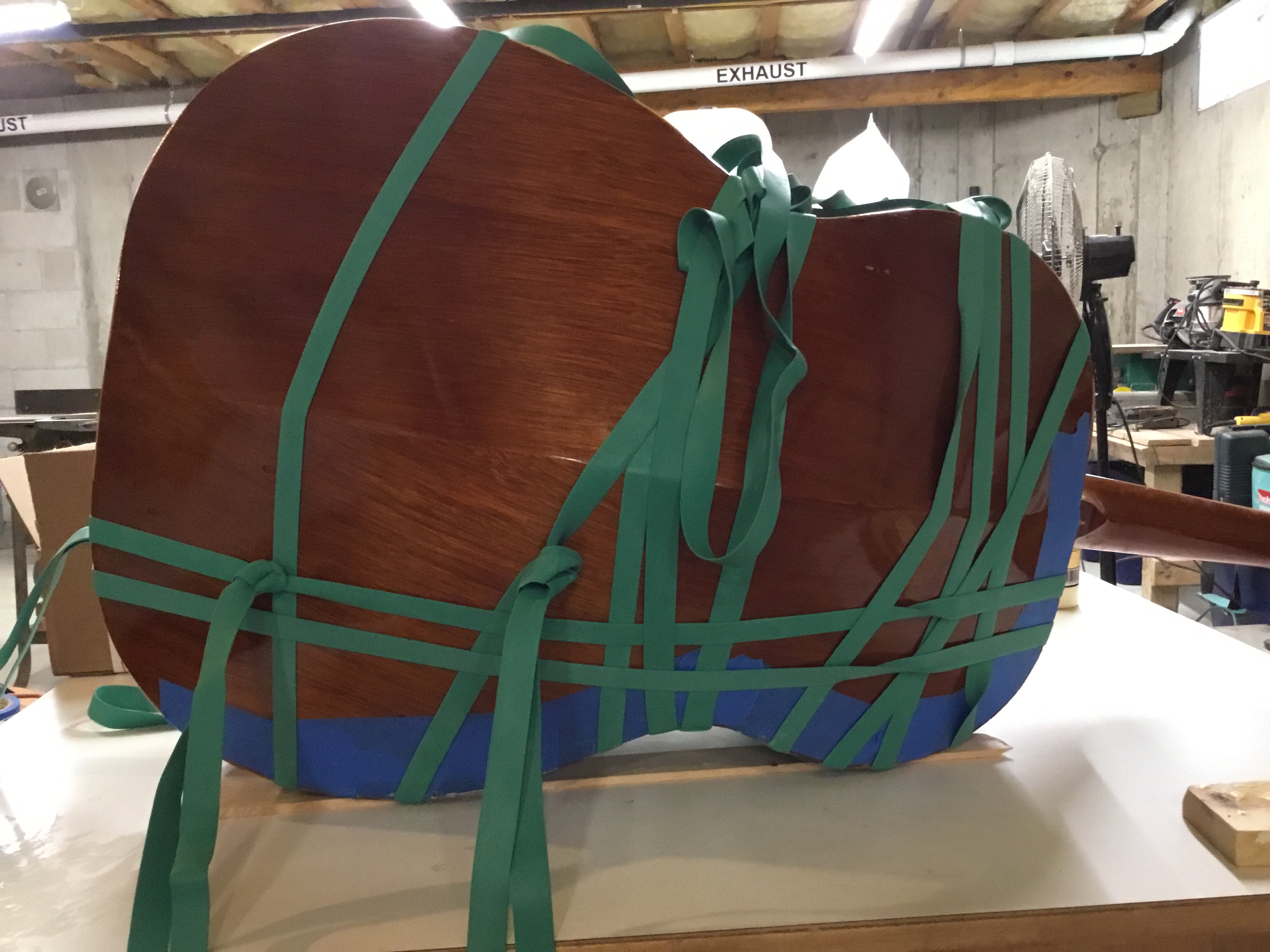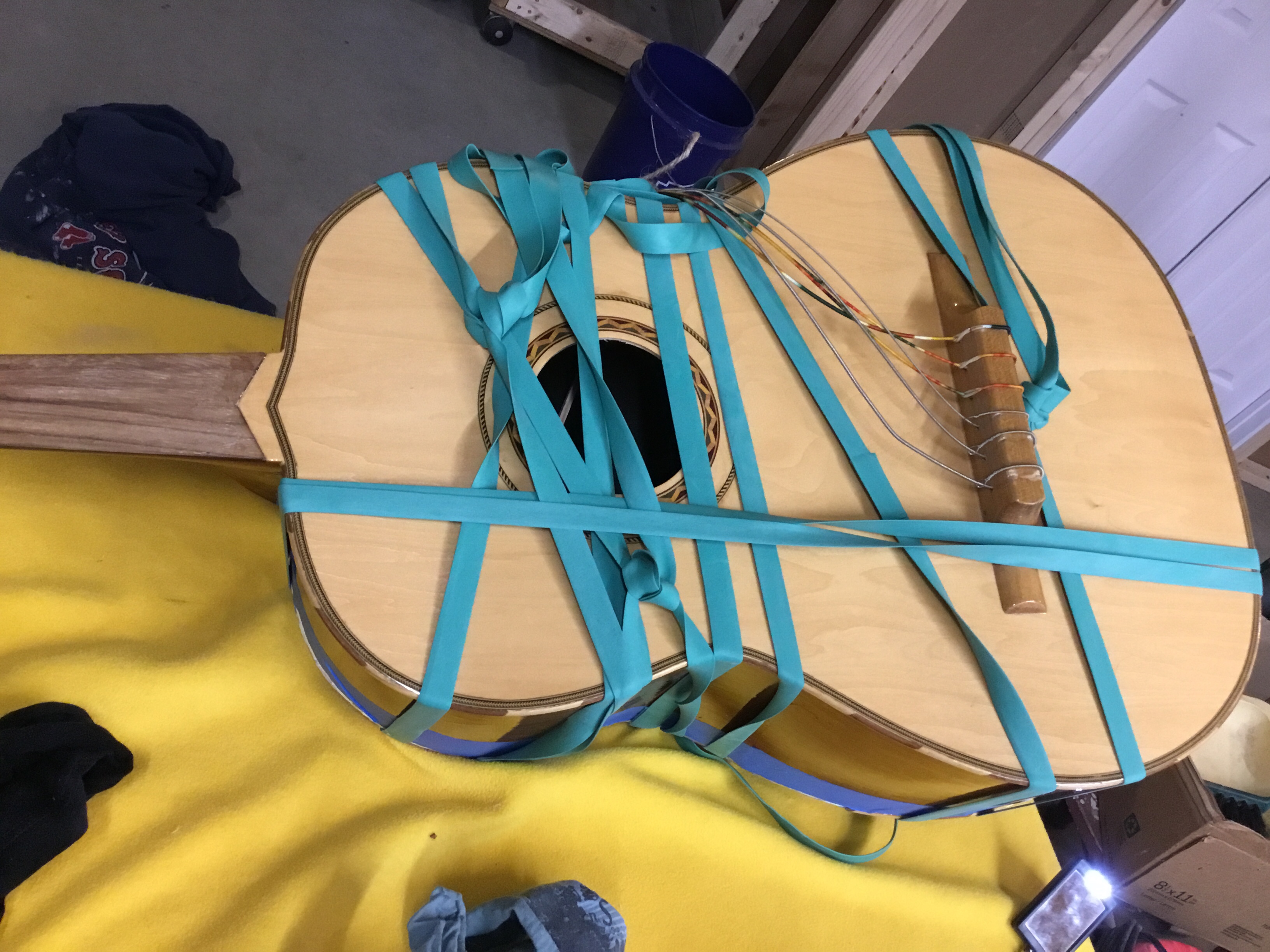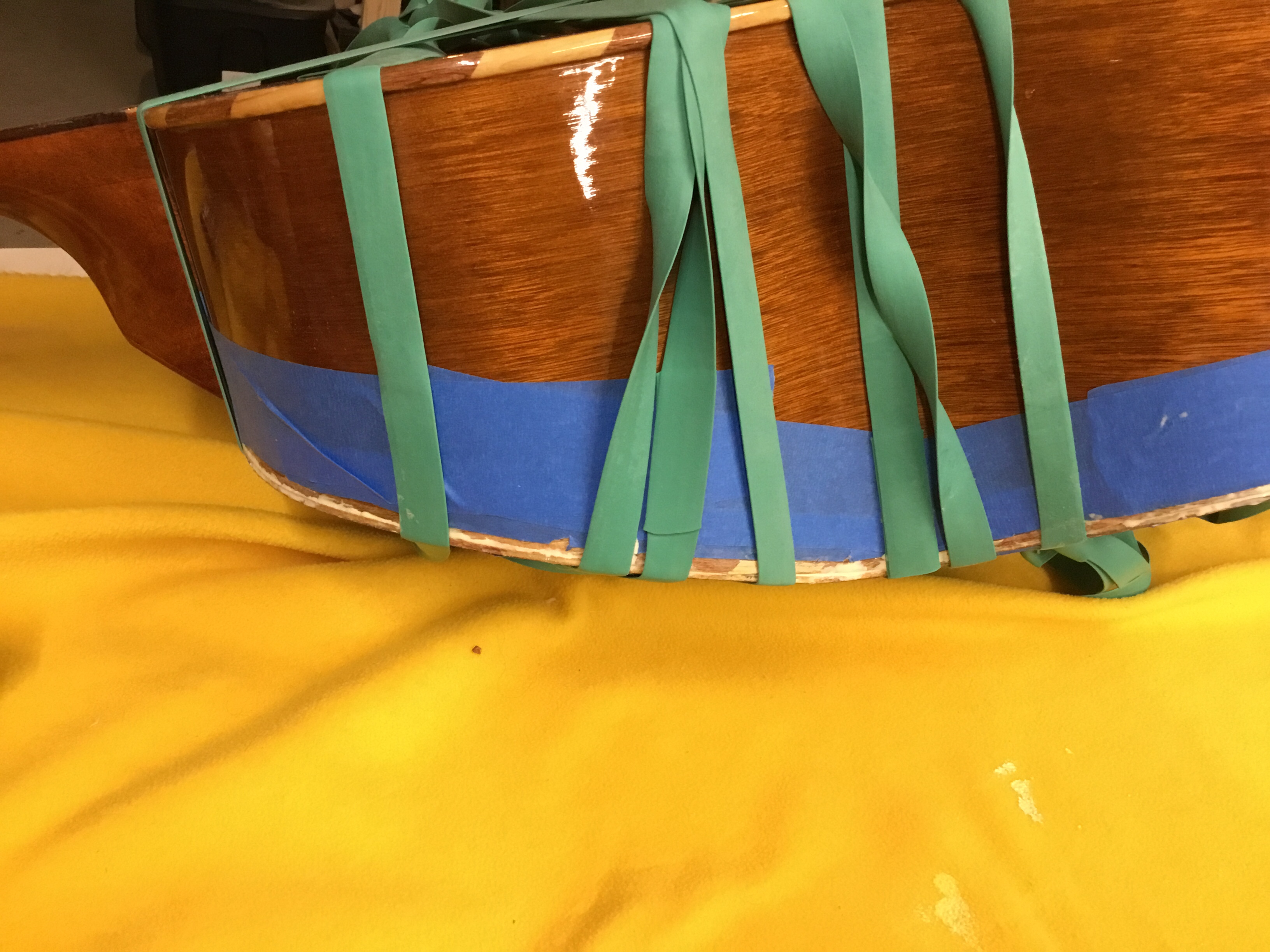 As noted earlier my tools are made to be used with somewhat more traditional instruments (aka not instruments with massive, wicked funky backs). Typically to attach sides to the back or top of a guitar a series of spool clamps are used. I learned a different technique from famed luthier William Cumpiano. He took a truck tire inner tube and cut it into a continuous strip. This was used to wrap the guitar box in a tight wrap. Fortunately for me, giant rubber bands are available from some luthier suppliers. I opted for this versus chasing down a truck mechanic! I added a decent amount of Titebond wood glue to the seam, and wrapped it up with bunch of gigantic rubber bands. This worked well on the contour of the Guitarron and the back held quite well. I added extra glue to the kerfing and the back to add stability.