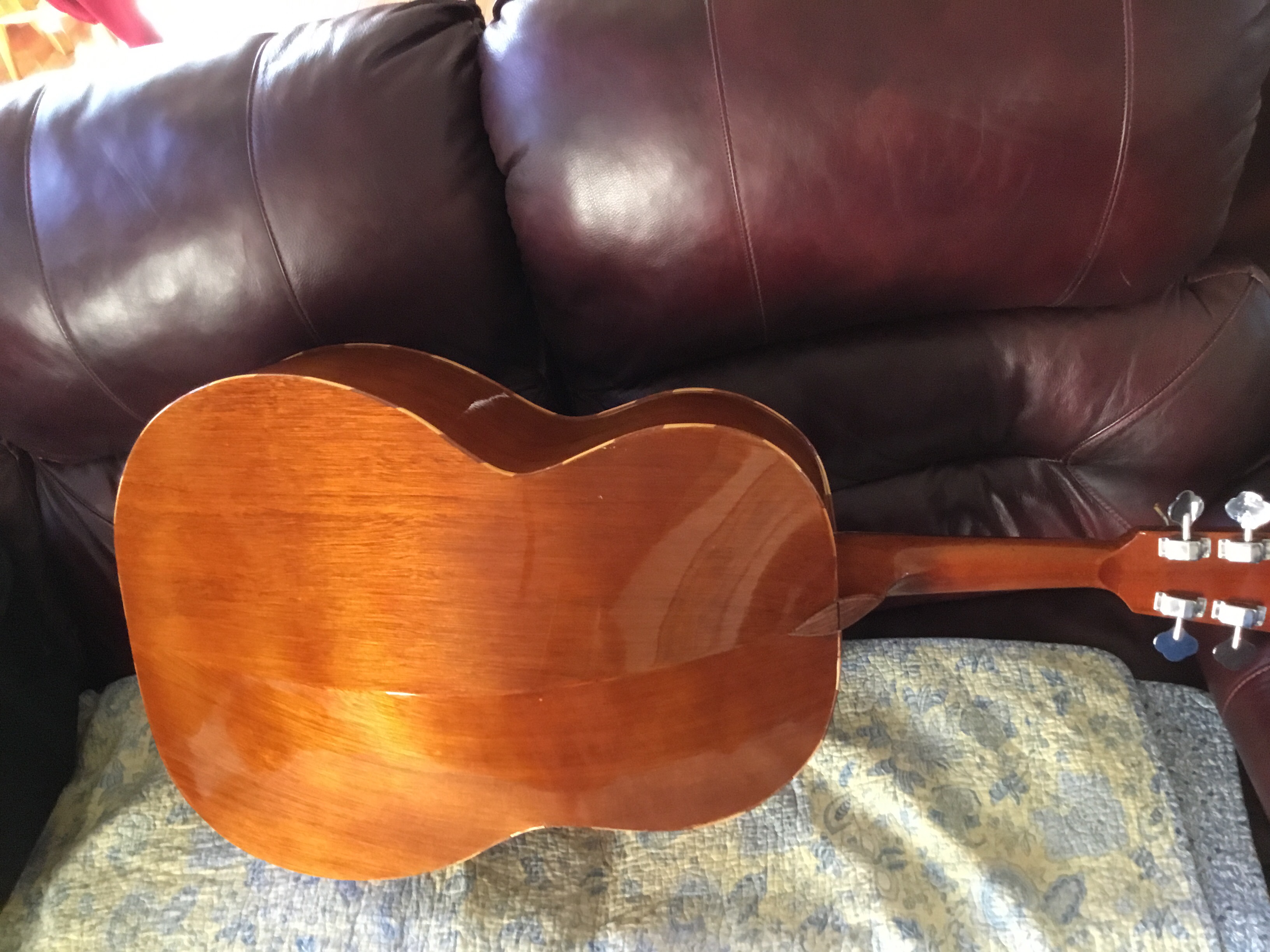 After the back was reattached to the side, it was time to address the crack along the back where the 2 pieces of the back came together at the neck. I cut a piece of mahogany about 1/2 inch wide, 3 inches long, and 3/8 inch thick and glued it diagonally across the 2 back pieces near the neck where the angle of the back was not severe. This provided the support necessary to keep the 2 back pieces from separating anymore. I then cut a thin piece of mahogany about a 1/2 inch wide, 5 inches long, and maybe 1/16 thick and glued this along the spine of the back. Since it was so thin it made it possible to press this into the contour of the seam, sealing the deal. Titebond wood glue is a wonderful thing.