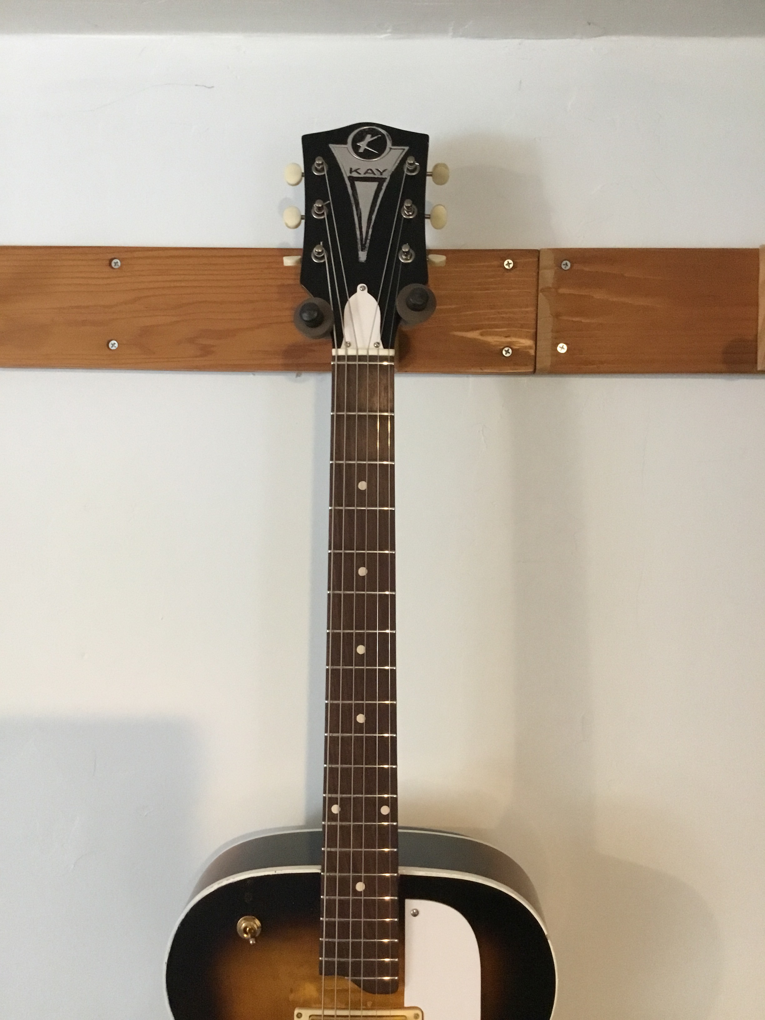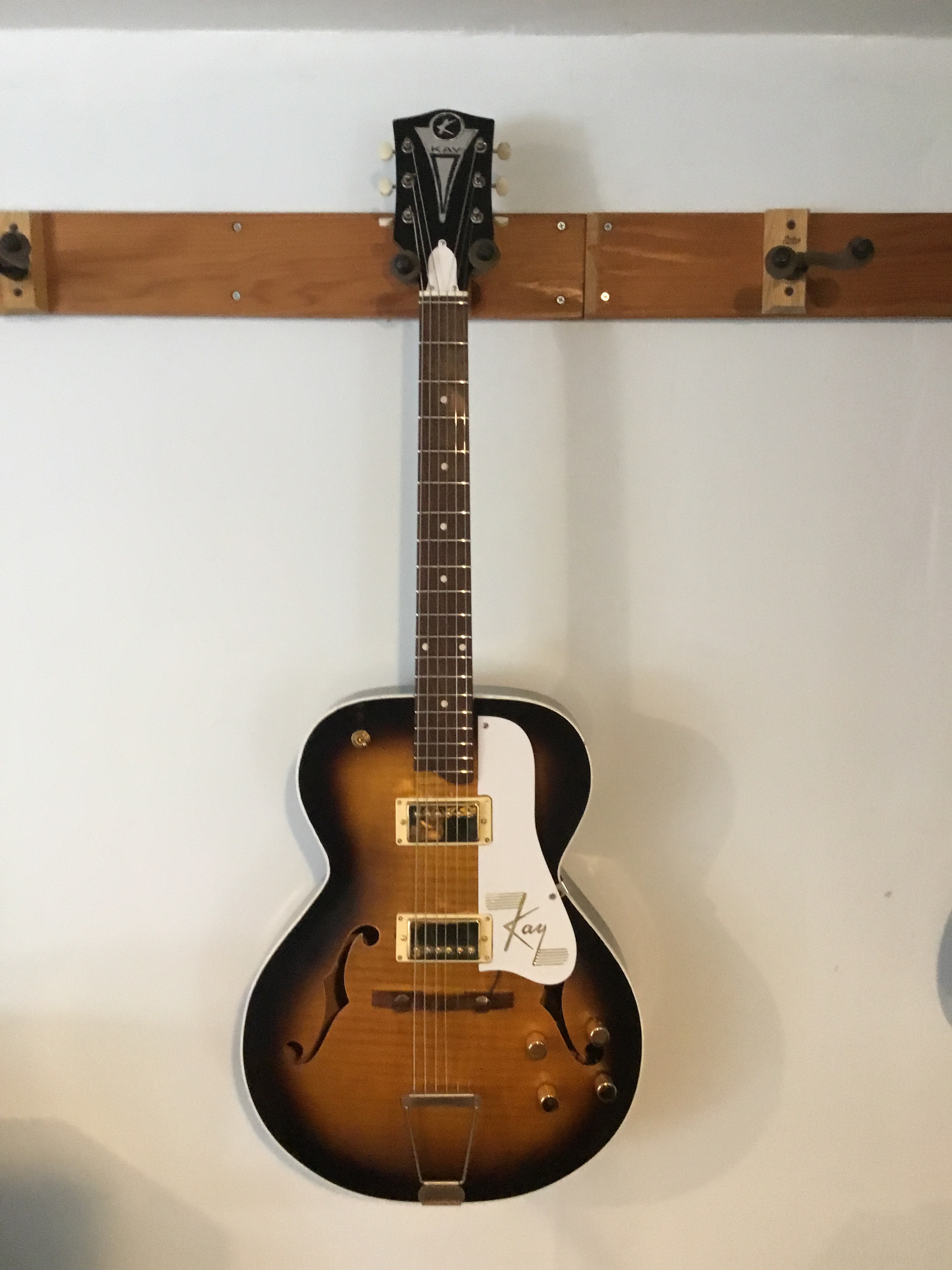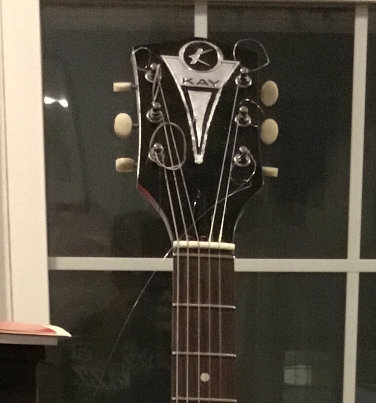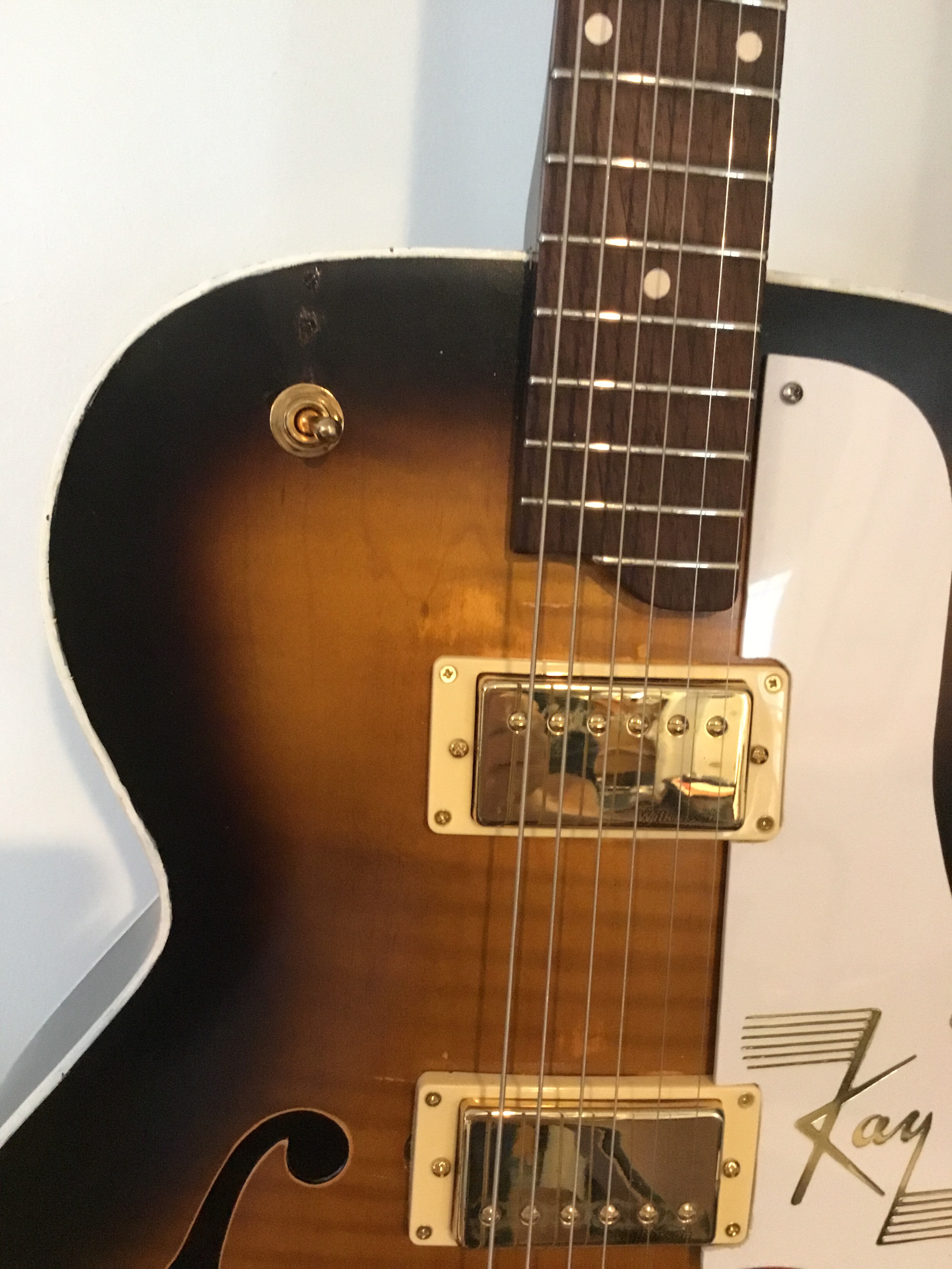 I installed a period appropriate, nifty, Kay pickguard and a couple of crummy Korean pickups … which are perfect for this guitar!