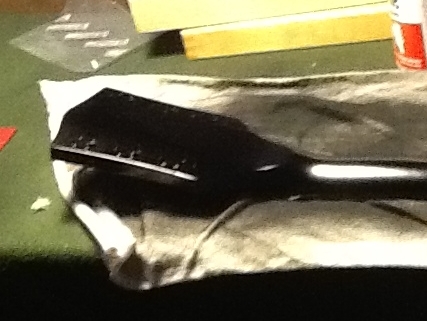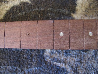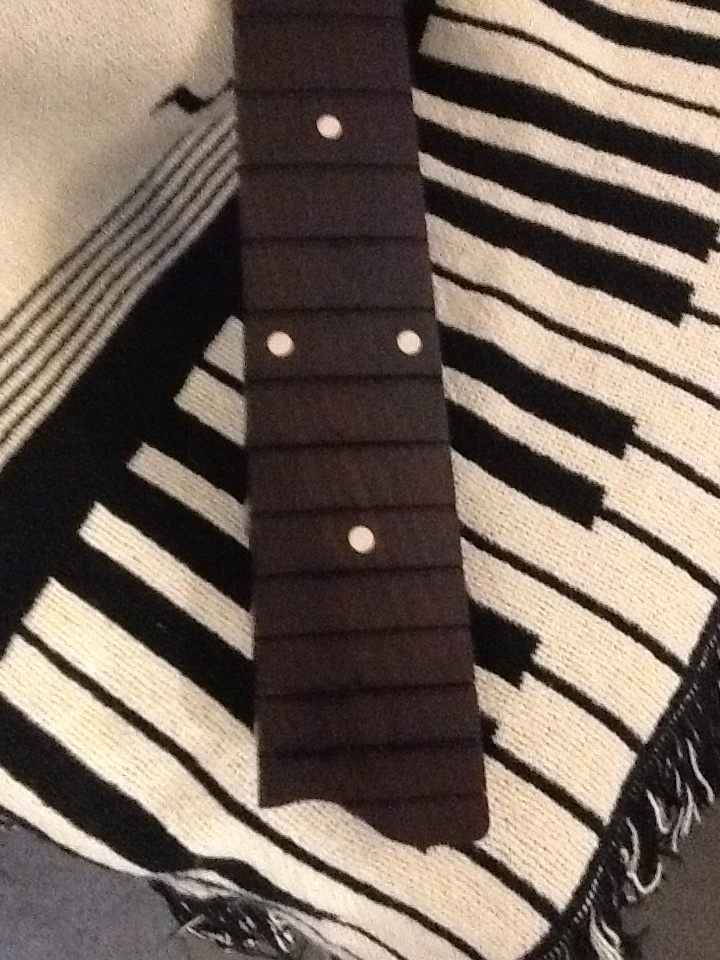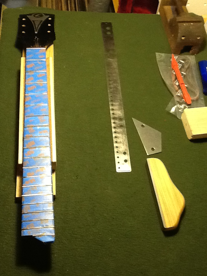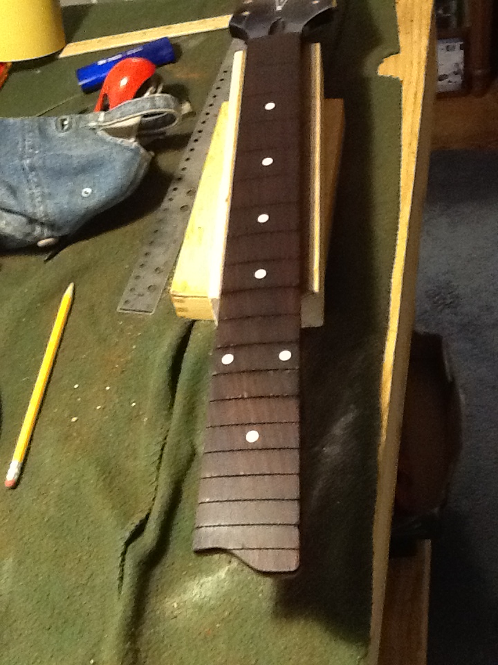 I started by removing the neck and cutting a “swoop” in the fingerboard. I was so happy with the results that I vowed to do that with all my new guitars. It looked really cool. I sanded the fingerboard to remove pitting, installed missing fret marker dots, oiled it, and installed nice fat brass frets, painted the neck with black nitrocellulose lacquer, and polished meticulously.