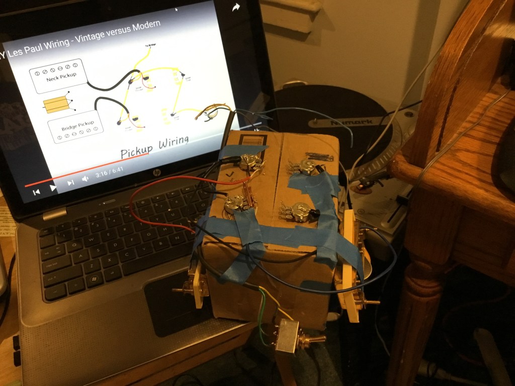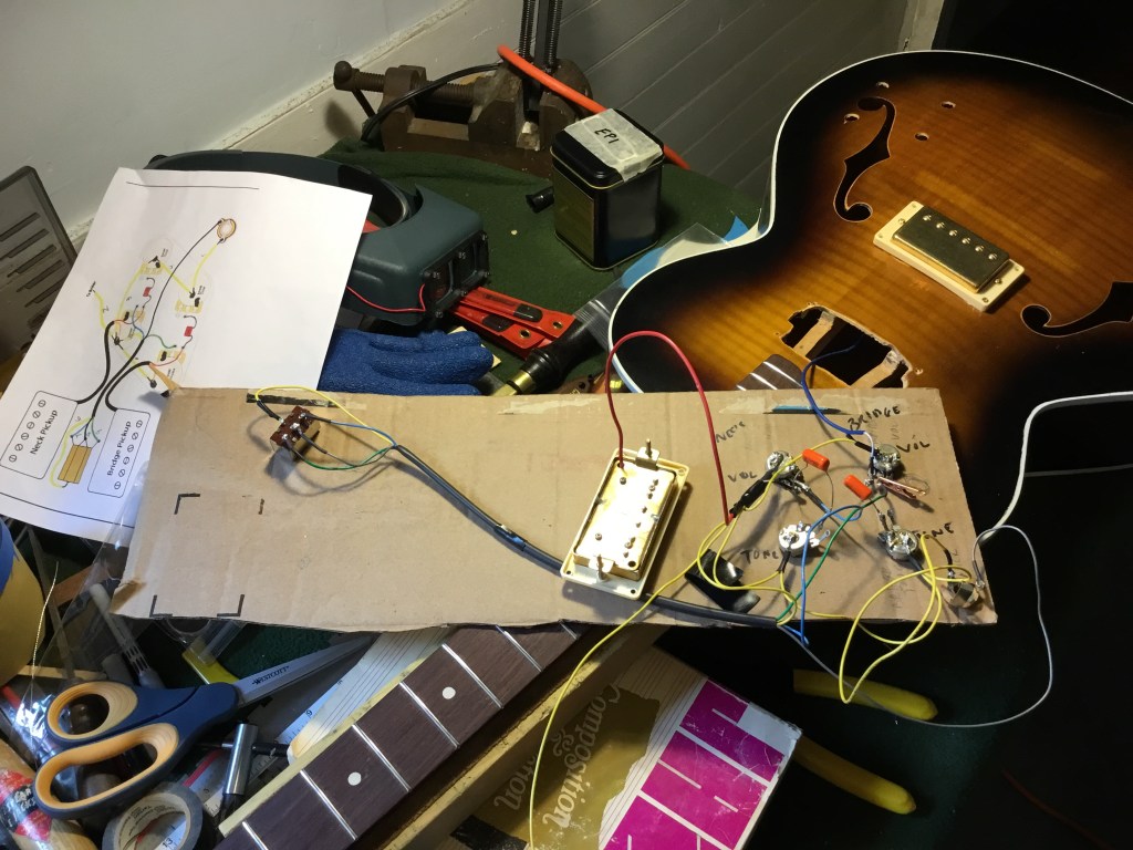 Cutting holes for the volume and tone controls and the jack for the patch cord. Installing the pickups.