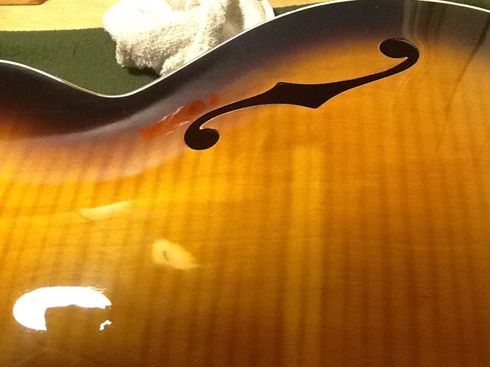 I began hours of buffing and polishing, filling imperfections with colored CA glue, using microfiber abrasives to make the finish sparkle. I painted the “bindings” (they’re painted on these guitars), installed an end pin, and cut the pickup slots out. I applied several coats of clear nitrocellulose lacquer and polished, polished, buffed, and polished some more.